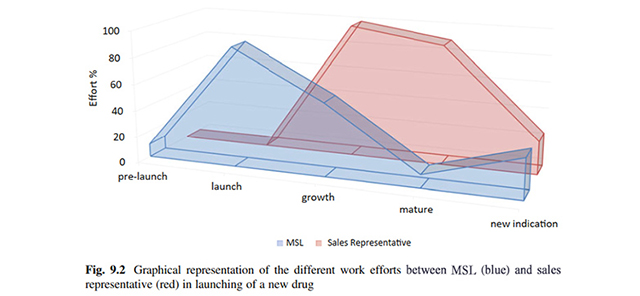 例如,如果我们关注一种新药的开发及其上市,值得注意的是,这两个人物的工作量随着时间的推移发生了很大变化。根据我的经验,我试图在下图中以图形方式表示这一方面。MSL在产品生命周期内逐渐减少其活动,而销售代表从上市开始就成倍增加其活动。